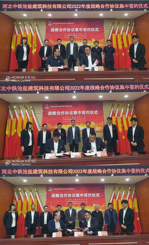 河北中鐵滄鹽建筑科技有限公司執(zhí)行董事長(zhǎng)王峰偉,黨支部書記、總經(jīng)理王志巖,總會(huì)計(jì)師李紅標(biāo),河北建工物流有限公司黨總支書記、董事長(zhǎng)劉云濤,雄安區(qū)域總經(jīng)理馮曉潔,雄安區(qū)域副總經(jīng)理李增光,滄州區(qū)域總經(jīng)理李勇,滄州鹽業(yè)集團(tuán)建筑工程有限公司總經(jīng)理姬文革,黨支部書記、副總經(jīng)理崔治宇,辦公室主任左志海,滄州市中潤(rùn)新型建材有限公司總經(jīng)理姜海亮出席簽約儀式,三家公司代表分別與中鐵滄鹽簽訂戰(zhàn)略合作協(xié)議。