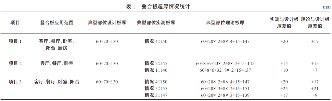 2019年初,對(duì)部分在施且采用疊合板的裝配式住宅項(xiàng)目進(jìn)行疊合板施工澆筑超厚情況調(diào)研,并對(duì)其中3個(gè)項(xiàng)目的調(diào)研情況進(jìn)行梳理。通過現(xiàn)場(chǎng)測(cè)量預(yù)制底板厚度、預(yù)制底板頂至鋼筋上皮的高度,推算疊合板澆筑成型后的實(shí)際厚度。