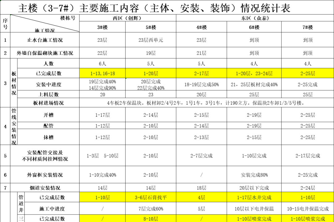 各樓棟專業(yè)工程師每日盤點(diǎn)通報(bào)現(xiàn)場(chǎng)進(jìn)度情況,每日早中晚對(duì)比,緊盯關(guān)鍵工序;緊盯各工序的最早開始時(shí)間,督促各工作按節(jié)點(diǎn)完成,為后續(xù)施工創(chuàng)造有利條件。