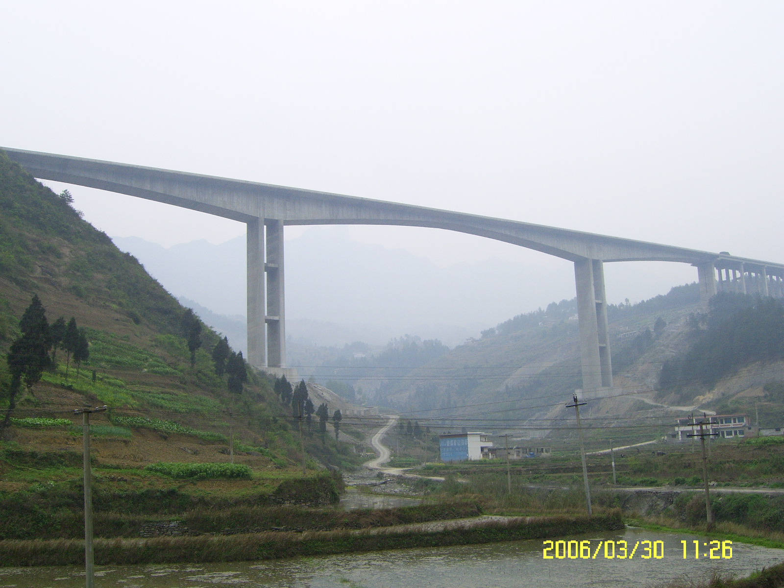 +整幅式連續(xù)剛構(gòu),其箱梁截面為單箱單室,頂板寬,底板寬,下部9#、10#兩個主墩為雙薄壁高墩,高度分別為、。該橋是國內(nèi)同類橋梁中罕見的集高、艱、難、險于一體的工程,主跨跨度的整幅式單項單室堪稱全國之最。實踐證明,該橋的施工離不開科技創(chuàng)新,通過施工,總結(jié)出了一套省內(nèi)大跨度整幅式單箱單室三向預(yù)應(yīng)力連續(xù)剛構(gòu)高速、優(yōu)質(zhì)、安全施工的新技術(shù)、新經(jīng)驗。通過驗證,各項技術(shù)指標(biāo)均符合設(shè)計要求,全橋接縫平順,線型美觀。同時,施工中,自行研制了自錨式三角形掛籃,其結(jié)構(gòu)簡單,加工拼裝方便,采用液壓走行即快速又安全,剛度大,變形小,模板移動靈活,內(nèi)模板脫模立模移動快速方便,掛籃施工安全可靠。還總結(jié)了一套具有國內(nèi)先進(jìn)水平的大跨度連續(xù)剛構(gòu)施工線型控制技術(shù)和應(yīng)力監(jiān)測技術(shù),利用此套技術(shù),對大跨度連續(xù)剛構(gòu)橋進(jìn)行控制,保證了全橋高精度合攏,合攏誤差最大不超過,梁部各截面應(yīng)力值與設(shè)計相符,全橋質(zhì)量優(yōu)良,線型美觀。另,還對“機制砂高性能泵送混凝土的配制技術(shù)”進(jìn)行了研究并取得了成果,施工過程中混凝土的各項性能均符合設(shè)計和施工要求,該項技術(shù)在國內(nèi)建筑市場處于領(lǐng)先水平,也為國內(nèi)河砂缺乏省份澆筑高標(biāo)號高性能混凝土開創(chuàng)了先河,并獲得了2005年陜西省職工經(jīng)濟(jì)技術(shù)創(chuàng)新優(yōu)秀成果三等獎。韓家店I號特大橋的施工受到了貴州省交通廳等各方的極大關(guān)注,通過科技攻關(guān)和全體員工的努力,強化施工現(xiàn)場管理,于2005年底順利完工,施工過程中積極采用新技術(shù)、新材料、新工藝,為連續(xù)剛構(gòu)施工探索出了一套先進(jìn)、科學(xué)的施工方法,加快了施工速度,保證了工程質(zhì)量和施工安全,填補了貴州省內(nèi)多項空白,整套技術(shù)——“崇遵高速公路大跨預(yù)應(yīng)力箱型連續(xù)剛構(gòu)橋施工技術(shù)”獲得了集團(tuán)公司2006年度科技進(jìn)步一等獎。